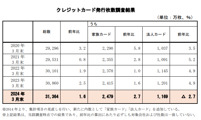 クレジットカードの発行枚数は、当然ですが「個人」が占める割合が最も多く、「家族カード」と「法人カード」はまだ成長の余地がありそうです。