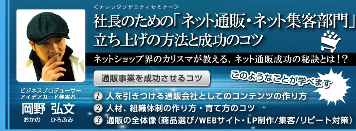 通販ビジネスの仕掛け人、岡野弘文のセミナーです。