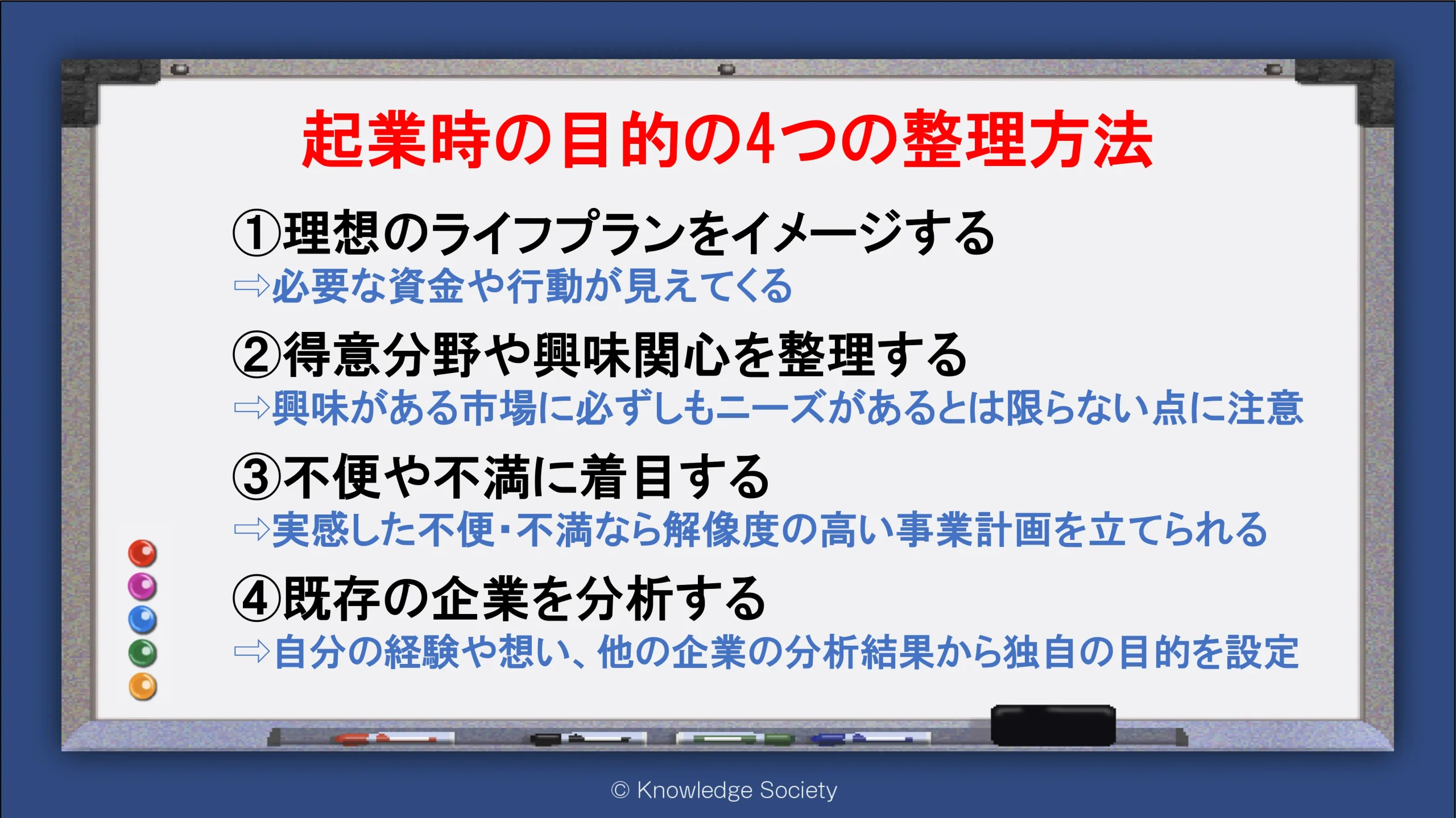シェアオフィス・バーチャルオフィス@東京都千代田区|ナレッジソサエティ > 起業時の目的の4つの整理方法