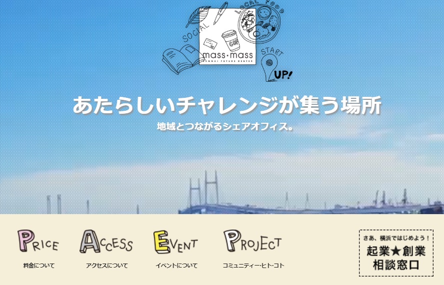 「 mass×mass」は、関内イノベーションイニシアティブ株式会社が運営するシェアワークプレイスです。 コワーキングスペース、シェアオフィス、ワークショップスタジオがひとつになったコミュニティプラットフォーム。 多様なステージで活躍する人たちが集い、対話を通して未来を創るプロジェクトです。あなたも「mass×mass」で、新しいビジネスやプロジェクトを始めてみませんか。(公式HPより) |