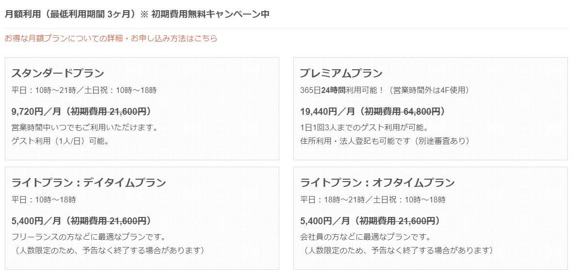サテライト 月額 5,000円 フリーデスク 月額 19,000円 マイデスク 月額 25,000円 |