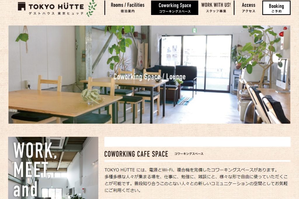 【詳細】TOKYO HÜTTE には、電源とWi-Fi、複合機を完備したコワーキングスペースがあります。多種多様な人々が集まる場を、仕事に、勉強に、雑談にと、様々な形で自由に使っていただくことが可能です。普段知り合うこのとない人々との新しいコミュニケーションの空間としてお気軽にご利用ください。(HP)