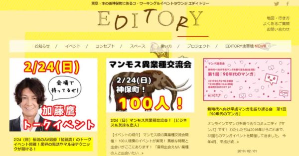 エディトリーの意味は、領域(TERRITORY)を編集(EDIT)すること。情報に敏感なライター、枠にとらわれない編集者、アクティブなフォトグラファー、メディアを売り出すプロデューサーなど、自由な発想でビジネスを考える人たちのために、名づけました。集うメンバーの知識やスキルやアイデア、そして、シェアした空間が重なり合うことで、自分の専門領域を超えた新たな何かを編集(EDIT)していける。そんな自由度の高い場を目指します。(HP)