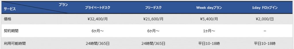 プライベートデスク、フリーデスク、weekday、1dayの4つのプランがあります。