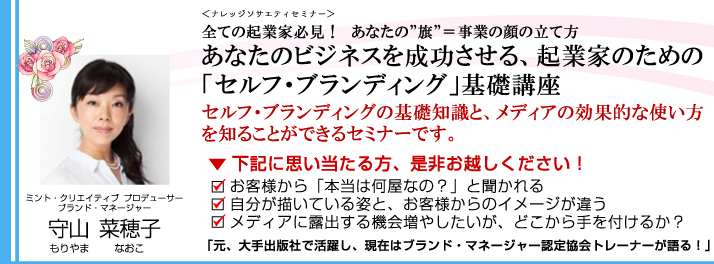 シェアオフィス・バーチャルオフィス@東京都千代田区|ナレッジソサエティ > 起業家向けイベント・セミナー > セミナー > 【満員御礼】あなたのビジネスを成功させる、起業家のための「セルフ・ブランディング」基礎講座【2014年11月7日開催】 > 守山菜穂子 バナー