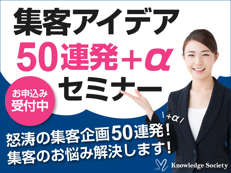 シェアオフィス・バーチャルオフィス@東京都千代田区|ナレッジソサエティ > 起業家向けイベント・セミナー > 起業&独立 > 集客アイデア50連発+αセミナー【2018年6月1日】 > 集客セミナー1