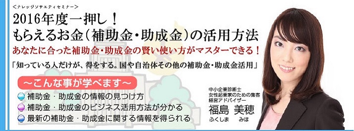 シェアオフィス・バーチャルオフィス@東京都千代田区|ナレッジソサエティ > 起業家向けイベント・セミナー > セミナー > 2016年度一押し!もらえるお金(補助金・助成金)の活用方法 > 福島美穂バナー(助成金)