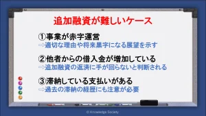 追加融資の可否は過去の業績にも大きく左右されます。中には追加融資の審査が難しい状況の方もいるでしょう。