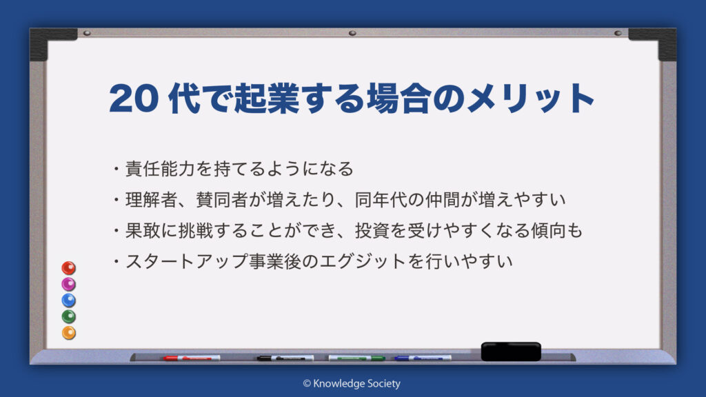 また、20代で始めた事業はエグジットが見えやすい世代でもあります。20代前半でスタートアップし、20代後半でエグジットするというビジネスプランが組みやすいのも強みと言えます。スティーブ・ジョブズ氏は25歳でアップルを上場、堀江貴文氏は27歳の時にライブドアを上場させるなど、20代起業家のロールモデルが多く存在します。