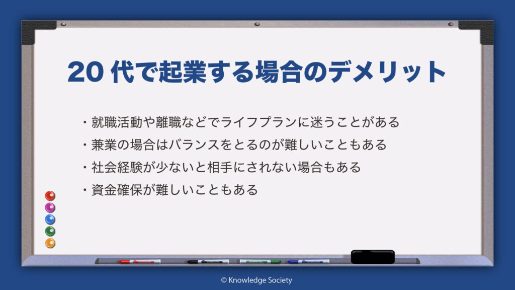 もちろん20代後半までは、社会経験の乏しさや信用力において苦労することは否めませんし、起業時に収入源がないと生活の不安定さはあるでしょう。しかしそれらを差し置いても、20代で起業することはチャレンジそのものが資産になると言っても過言ではないでしょう。
