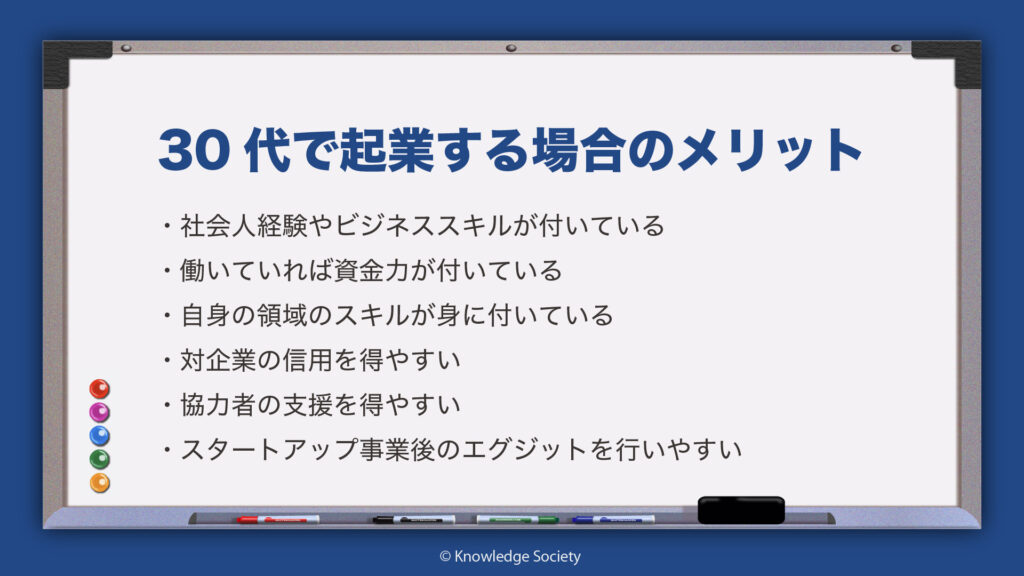 年齢的なことで言えば、30代は20代よりメリットを享受しやすい年代です。社会的制約や環境的制約も薄れ、自分の力を試すには最適のステージでしょう。腰を据えて、じっくりと自身のビジネスに取り組める年代でもあります。