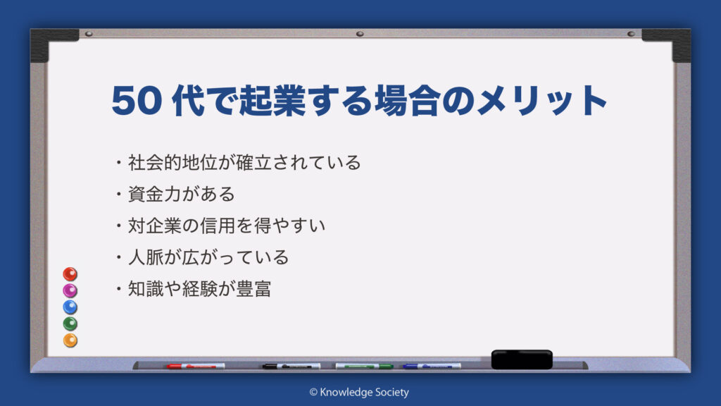 最後は50代で起業するメリット・デメリットです。50代ともなれば他の年代に比べてかなりの社会経験があり、実績や地位を確立している人が多いです。40代同様、身体的には無理がきかなくなってくる年代ですが、起業家としてはどうでしょうか。
