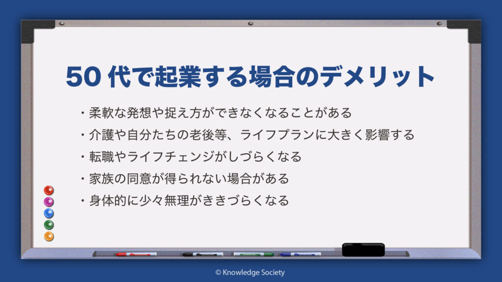 この世代のデメリットは、実はそう大したことはありません。上記にいくつか記載していますが、10代、30代と違って一番のびのびと起業できる世代であるとも思います。