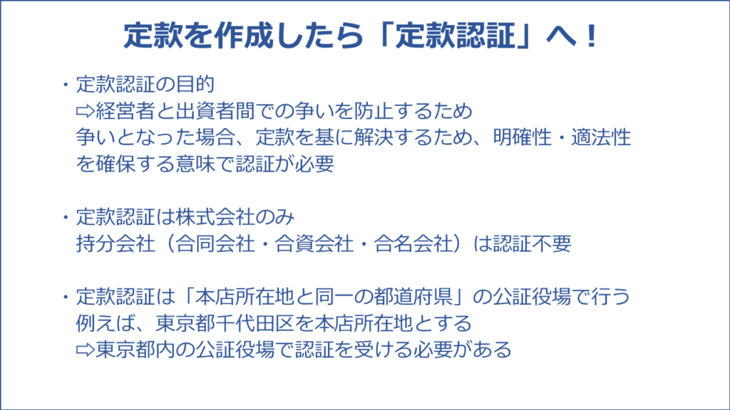 定款認証の主な目的は、経営者と出資者間における争いの防止です。