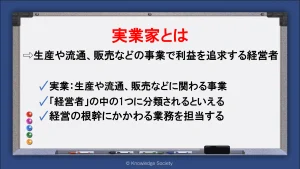 実業家とは、一般的に「生産や流通、販売などの事業を通じて利益を追求する経営者」を指します。