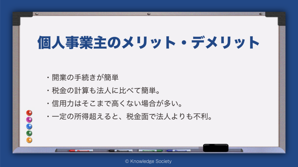個人事業主として開業するにあたってのメリットとデメリットは以下のものがあります。