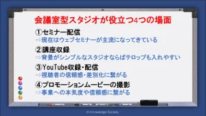 会議室型のスタジオはセミナー配信で大いに役立ちます。特に現在はコロナ禍て、会場に集まるのではなく、ウェブセミナーといった形で講演するケースが非常に多いです。