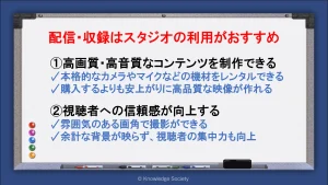 また、講座の場合は、動画編集でテロップなどを入れる場合もあります。そのため、自宅や事務室よりも、背景がよりシンプルな会議室型のスタジオの方が視聴者も見やすいと感じるでしょう。