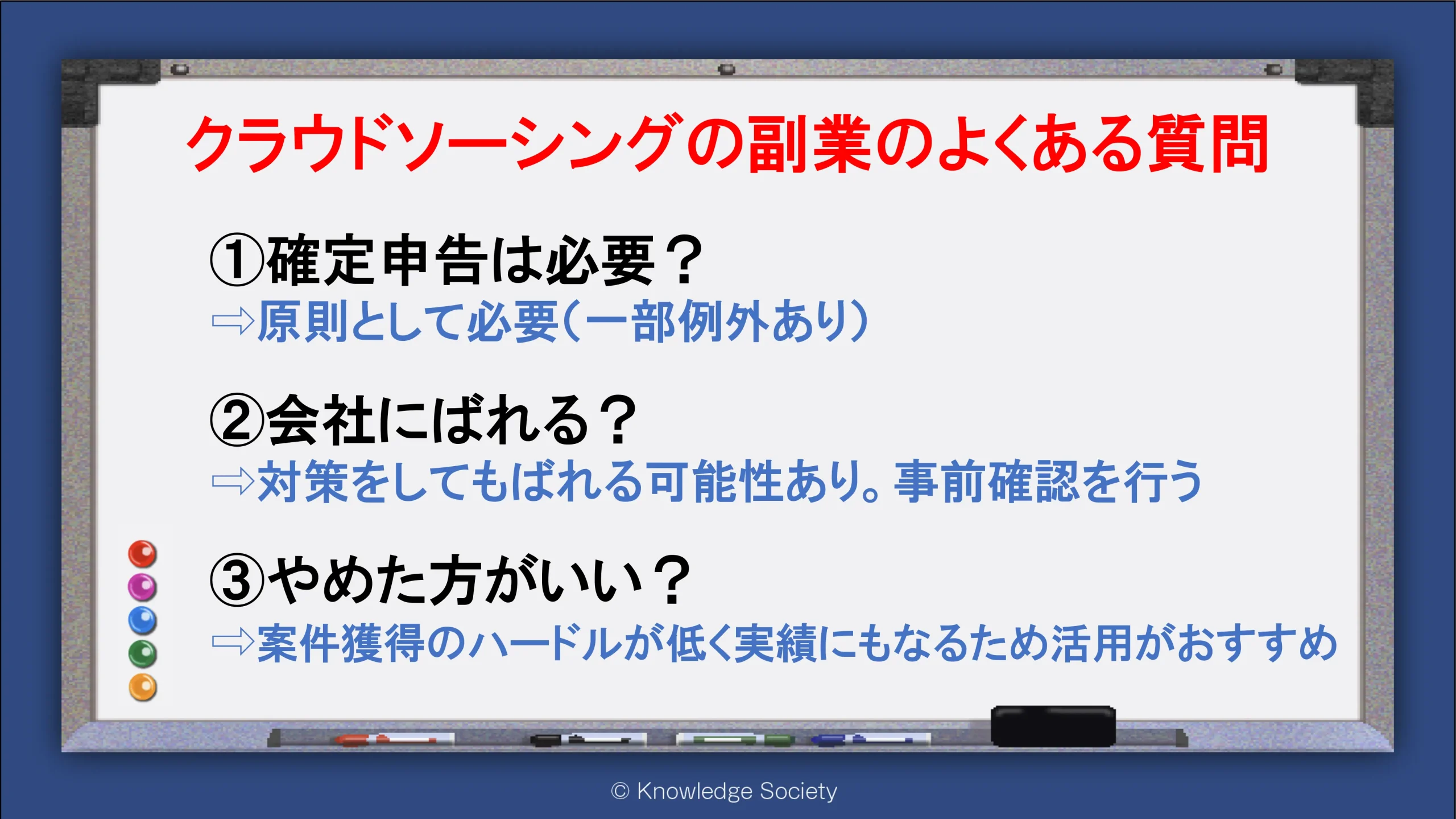 シェアオフィス・バーチャルオフィス@東京都千代田区|ナレッジソサエティ > 起業ノウハウ > 初心者の副業はクラウドソーシングがおすすめ!仕事内容や注意点、サービス8選も解説 > クラウドソーシングの副業のよくある質問