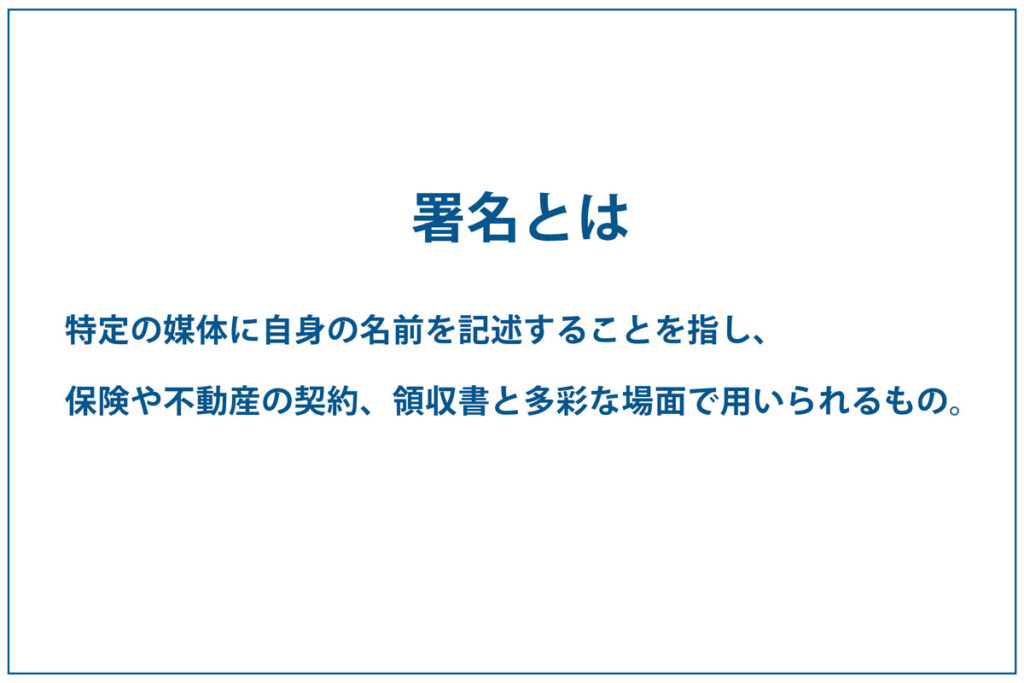 署名とは、特定の媒体に自身の名前を記述することを指しており、保険や不動産の契約、領収書と多彩な場面で用いられています。すなわち、ビジネスシーンだけに限った特殊な手続きではなく、法的責任を持ったほとんどの方が一度は経験しているのです。