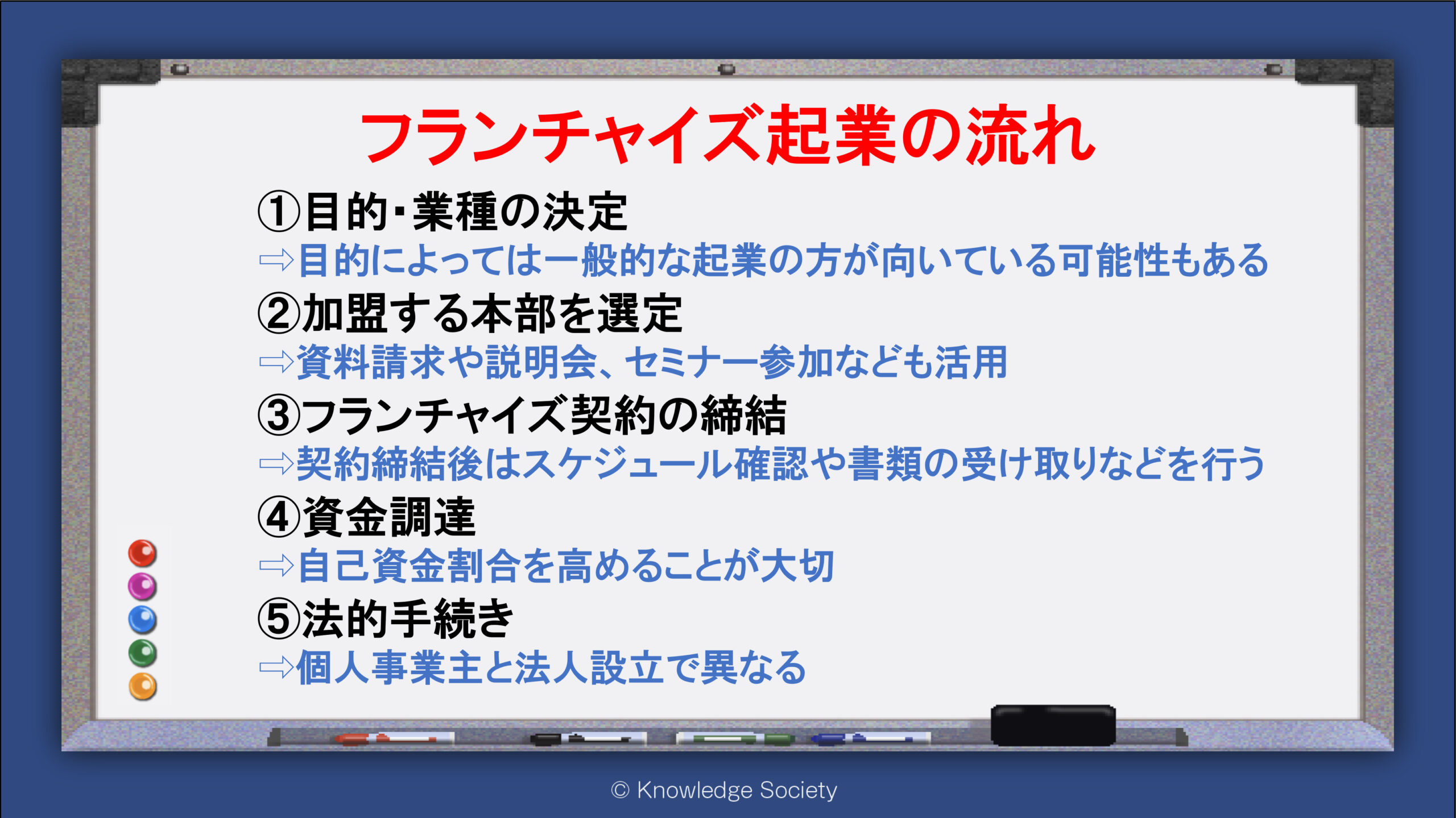 シェアオフィス・バーチャルオフィス@東京都千代田区|ナレッジソサエティ > 起業ノウハウ > フランチャイズ起業とは?仕組みやメリット・デメリット、おすすめの業種を解説! > フランチャイズ起業の流れ