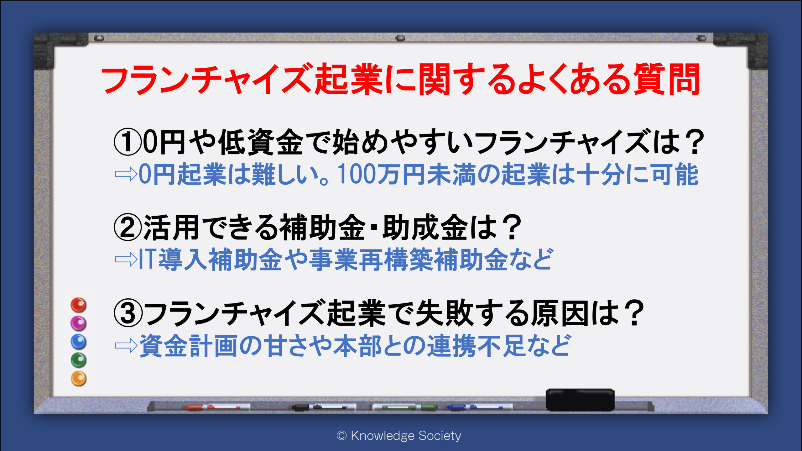 シェアオフィス・バーチャルオフィス@東京都千代田区|ナレッジソサエティ > 起業ノウハウ > フランチャイズ起業とは?仕組みやメリット・デメリット、おすすめの業種を解説! > フランチャイズ起業に関するよくある質問