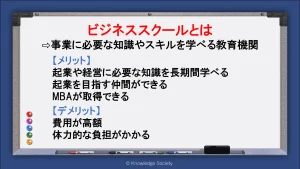 また、大学のビジネススクールの場合、通常2年間経営を学べます。そのため、起業全般の知識がない場合でも、幅広い分野を実務水準まで深く学べる点も魅力です。