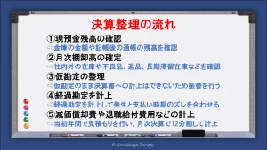 決算整理では、月次棚卸高の確定や仮勘定の整理、経過勘定の計上など、月末時点での最終修正を行います。