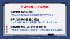 他にも、年次決算の目的が決算書の提出による株主等への情報提供である一方で、月次決算の目的は経営状態の明確化や進捗管理といった内部的なものとなっています。