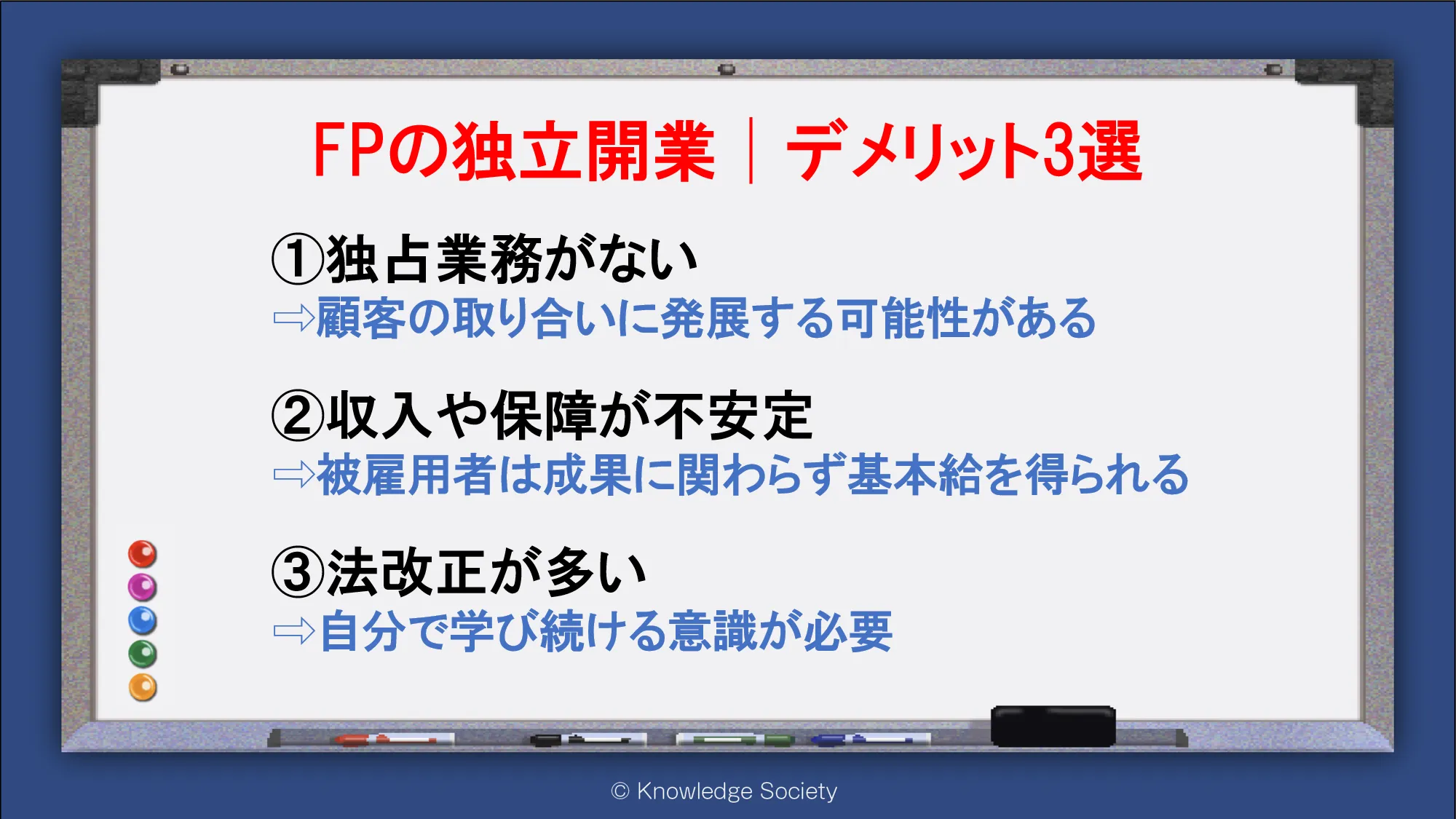 シェアオフィス・バーチャルオフィス@東京都千代田区|ナレッジソサエティ > 起業ノウハウ > FPで独立開業は難しい?起業の実態や年収・収入源、成功のポイントなどを解説 > FPの独立開業│デメリット3選