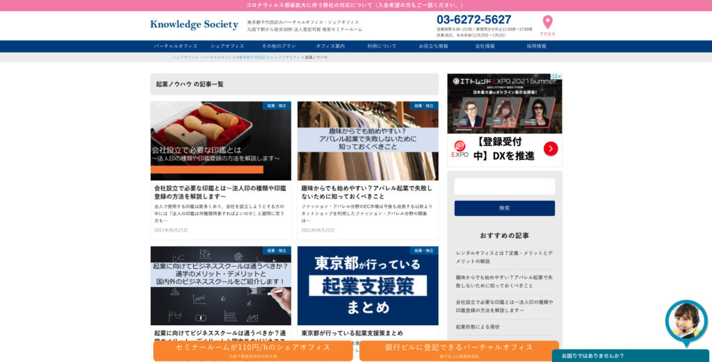 バーチャルオフィスを運営するKnowledge Societyが運営するサイトページになります。多くの起業家を見てきたからこそかける記事が豊富で、起業した際に困るであろう情報を網羅しております。