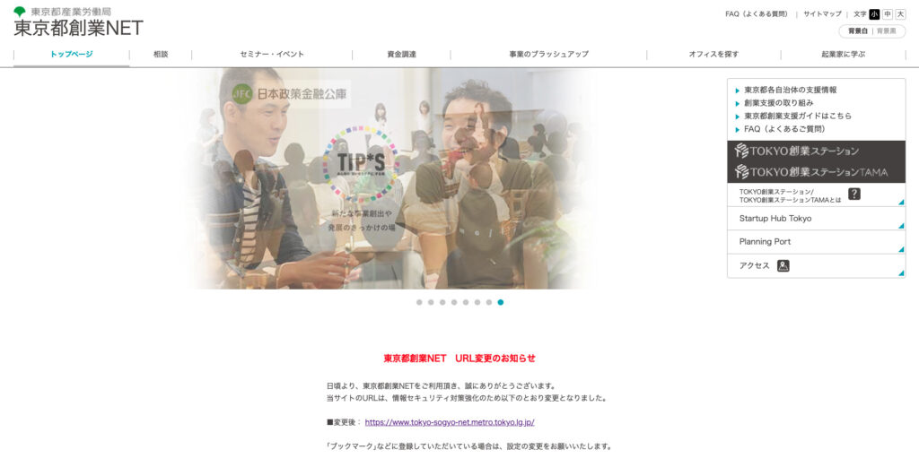 東京都で創業・起業する人向けの情報プラットフォームで、事業計画、開業支援、業者同士の交流といったスタートアップからバックアップまでワンストップで行なっています。