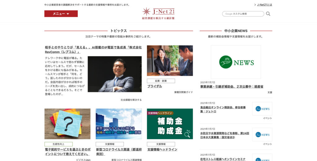 情報は、課題別(人事育成、組織、生産性。商品開発・市場開拓、資金繰り、事業継承など)や、情報別(経営力、現場力、起業・創業、支援情報、調査データ・業界レポート)にまとめてあり、欲しい情報を簡単に探し出せるのはもちろん、気になる情報が見つかるサイトです。また、キーワードが豊富なので、関連情報をたくさん得られるのも嬉しいポイントの一つとなっています。