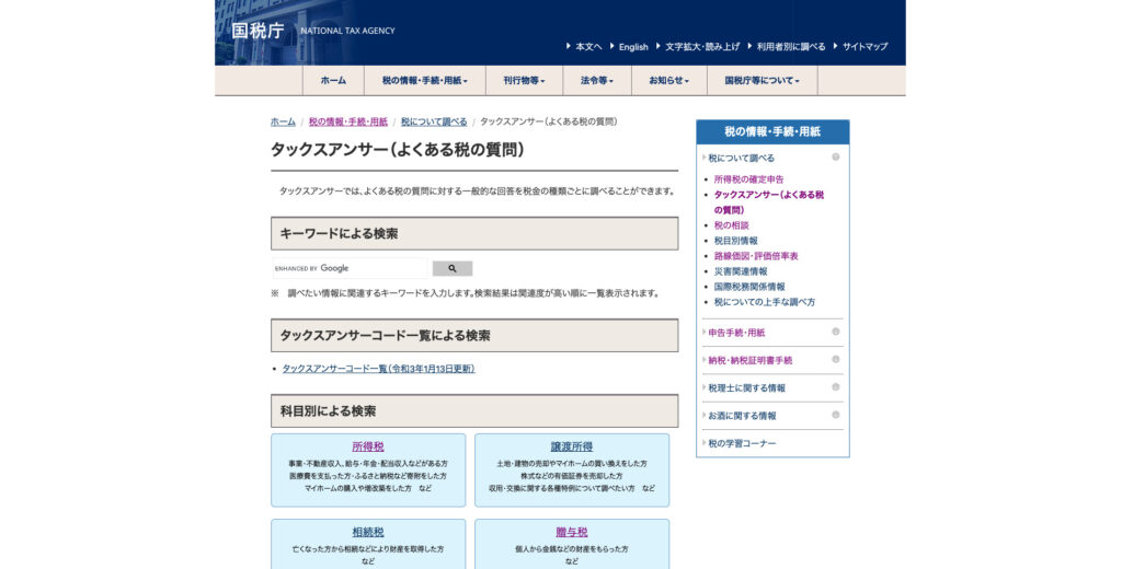 科目別に検索することができ、知りたい税金の情報をいち早く見つけることができます。