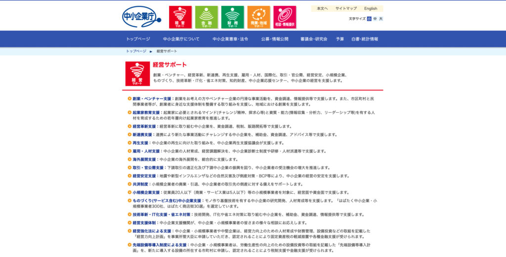 金融サポートのページでは、中小企業向けに政府系金融機関による融資、信用保証協会による保証なづ、金銭面での支援に関する情報や、実用化研究開発事業の案内など、資金調達に関する情報が多く掲載されています。