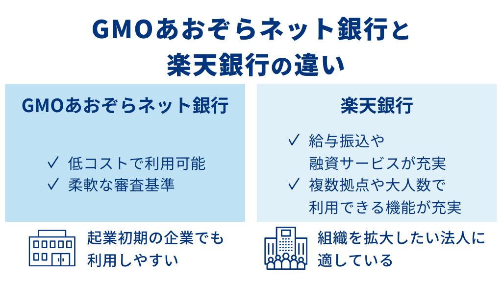 GMOあおぞらネット銀行と楽天銀行では、ターゲットとなる企業の規模やサービス内容に違いがあります。両銀行の特徴は以下の通りです。