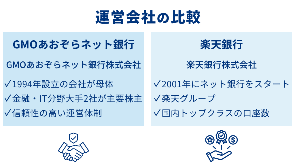 以下、GMOあおぞらネット銀行と楽天銀行の運営会社情報を一覧でまとめています。