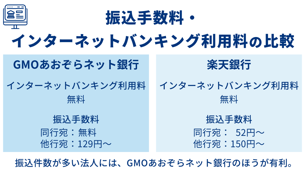 ここでは、GMOあおぞらネット銀行と楽天銀行の振込手数料およびインターネットバンキング利用料を比較します。