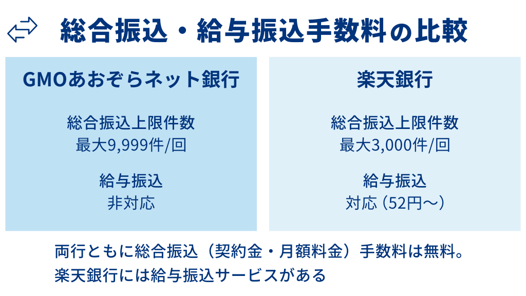 ここでは、GMOあおぞらネット銀行と楽天銀行の総合振込・給与振込手数料を比較します。