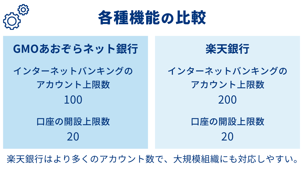 インターネットバンキングアカウントの発行数が多い分、組織が大規模化しても対応しやすい構造になっています。両行ともに、法人口座の開設数は最大20口座(マスター口座+サブ口座19件)となっており、用途別の資金管理を行う場合にも十分な枠が確保されています。
