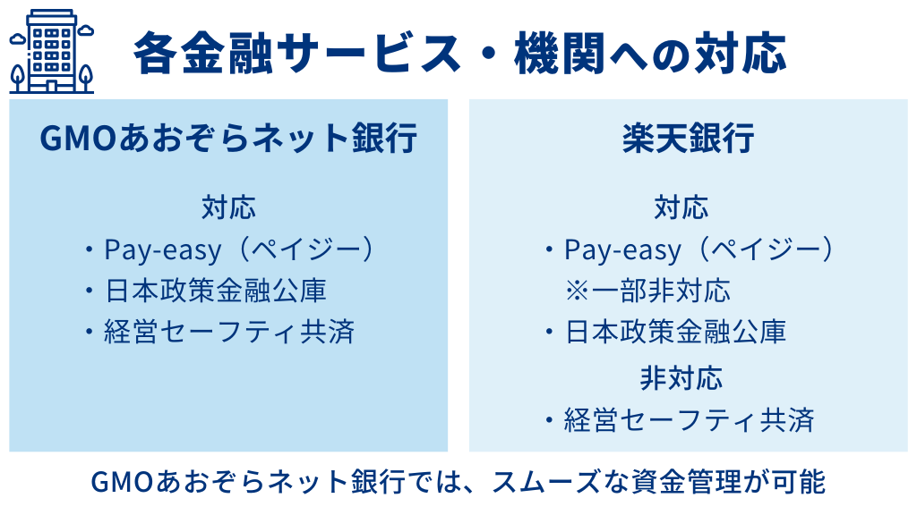 GMOあおぞらネット銀行と楽天銀行は、Pay-easy(ペイジー)や日本政策金融公庫など、外部機関との連携サービスに違いがあります。特に、税金や公共料金の納付方法、融資制度の利用など、日常の業務に影響する点を確認しておくことが重要です。