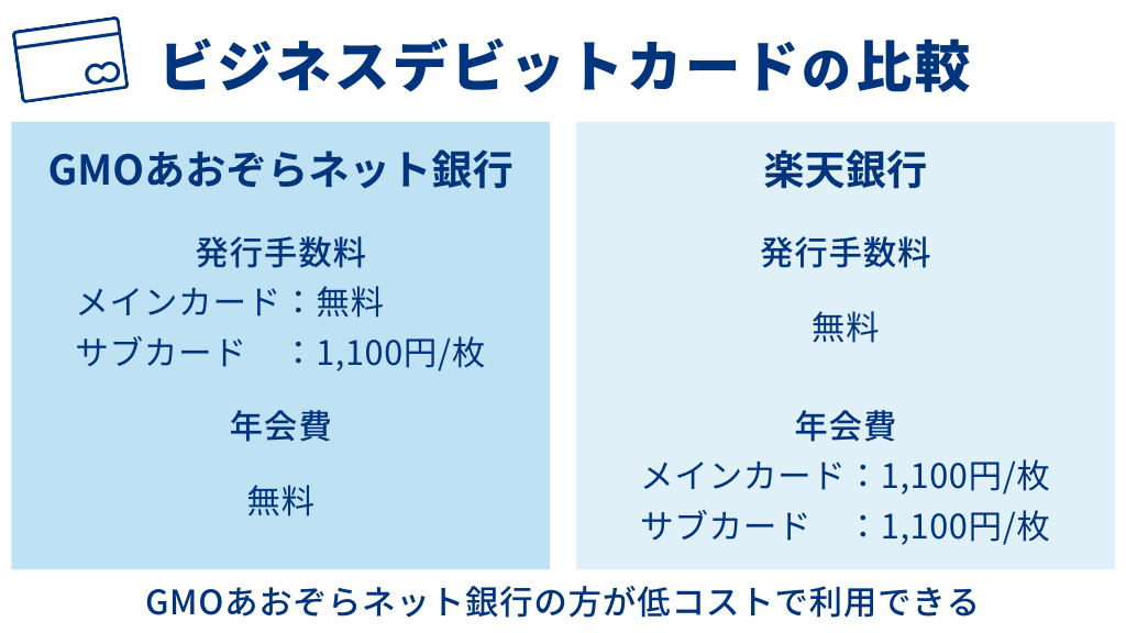 GMOあおぞらネット銀行と楽天銀行は、法人向けのビジネスデビットカードを提供しています。それぞれの発行手数料や年会費、還元率などに違いがあるため、コストや利便性を比較しながら選ぶことが重要です。
