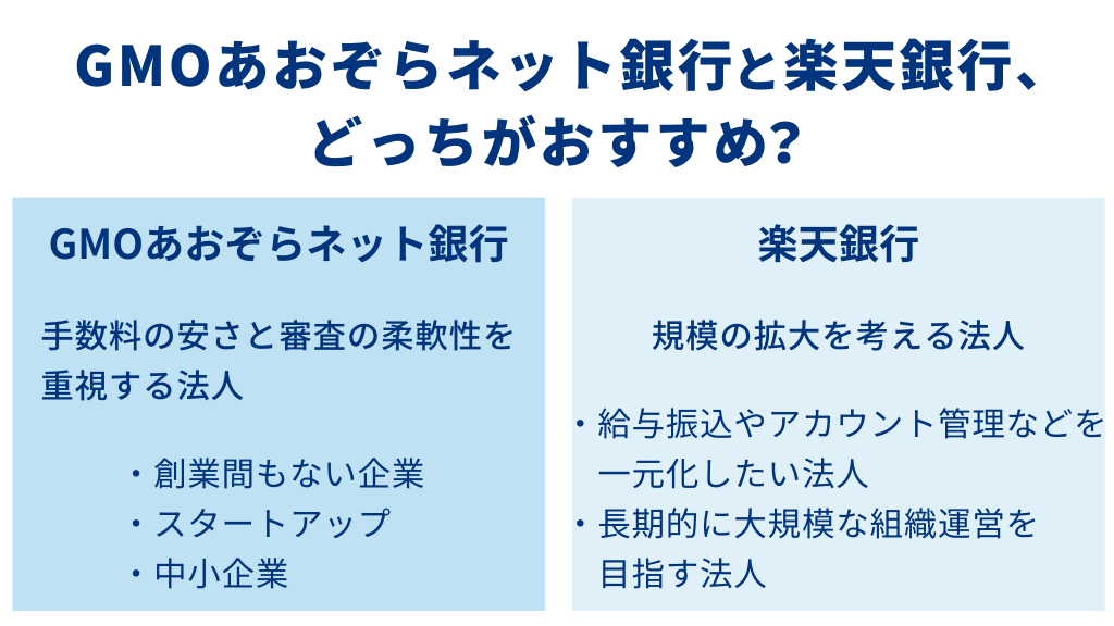 GMOあおぞらネット銀行と楽天銀行は、それぞれサービスの特徴が異なるため、どちらが適しているかは目的によって異なります。両行の特徴を踏まえると、それぞれがおすすめな法人は以下の通りです。