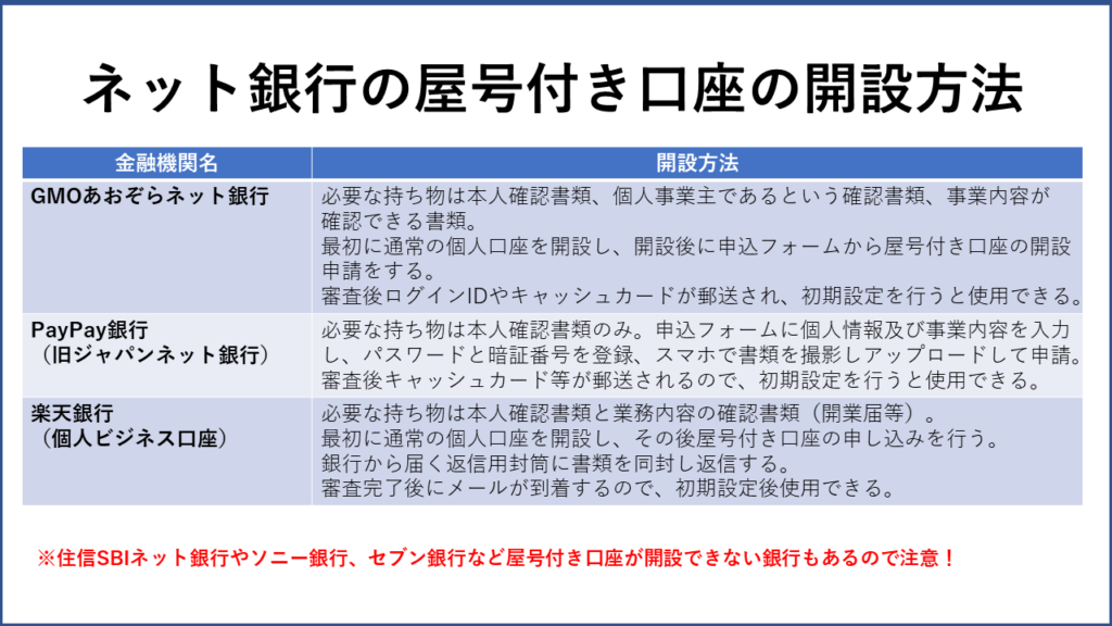 このような制約を受けたくない場合は、ネット銀行の屋号付き口座の開設も視野にしれましょう。