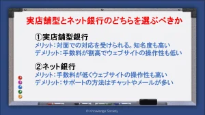 詳細は後述しますが、まず実店舗型の銀行かネット銀行かを選択します。