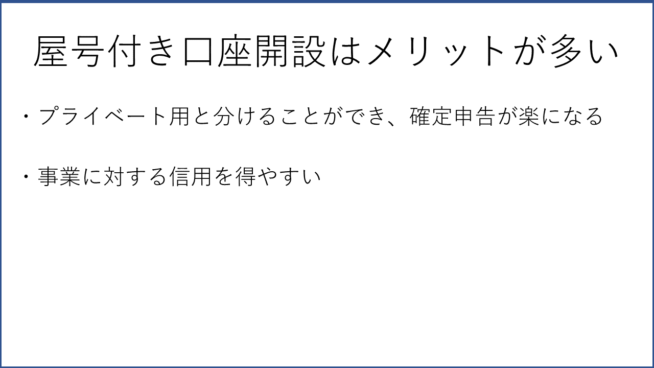 シェアオフィス・バーチャルオフィス@東京都千代田区|ナレッジソサエティ > 起業ノウハウ > > 個人事業主が開設できる屋号付き口座(屋号口座)とは?メリットや流れ、必要書類等を解説 > スライド2