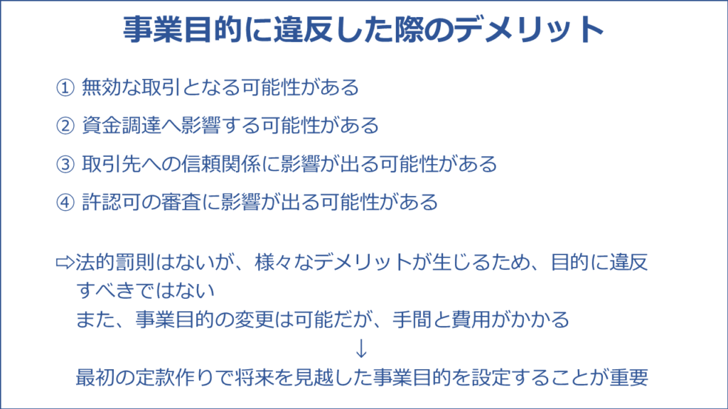 以下では、定款の事業目的に違反した際のデメリットや注意点を4点解説します。