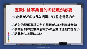 また、企業は事業目的に記載された内容以外の活動を原則行えない点にも留意してください。