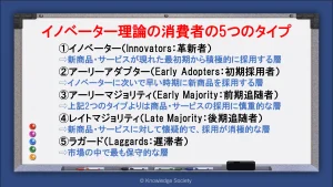 これらは新商品を購入する時期が早い順番となっており、革新者である「イノベーター」は最も早く新商品を採用する冒険的な層、一方で「ラガード」は最も保守的な層となっています。