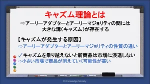 上述した通り、市場全体に新商品・サービスを普及させるためには、アーリーアダプターとアーリーマジョリティの間に生じるキャズムを乗り越える必要があります。